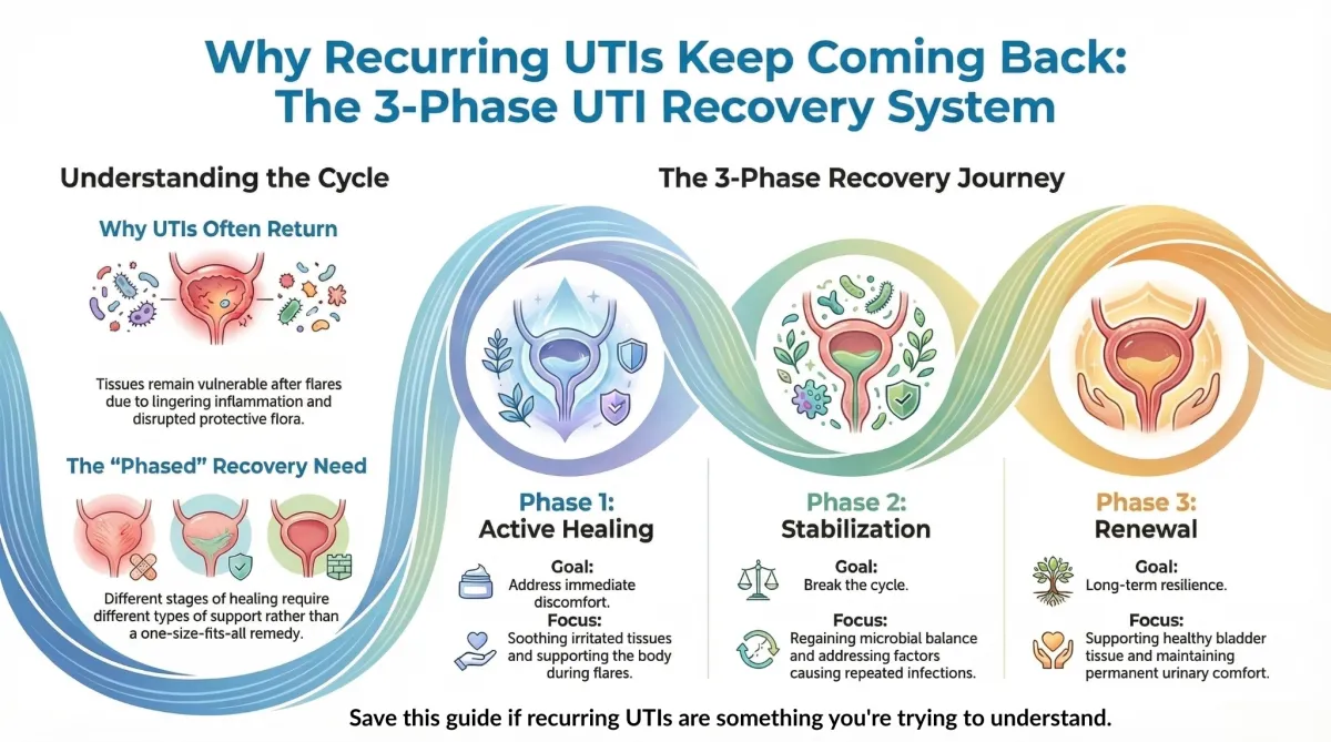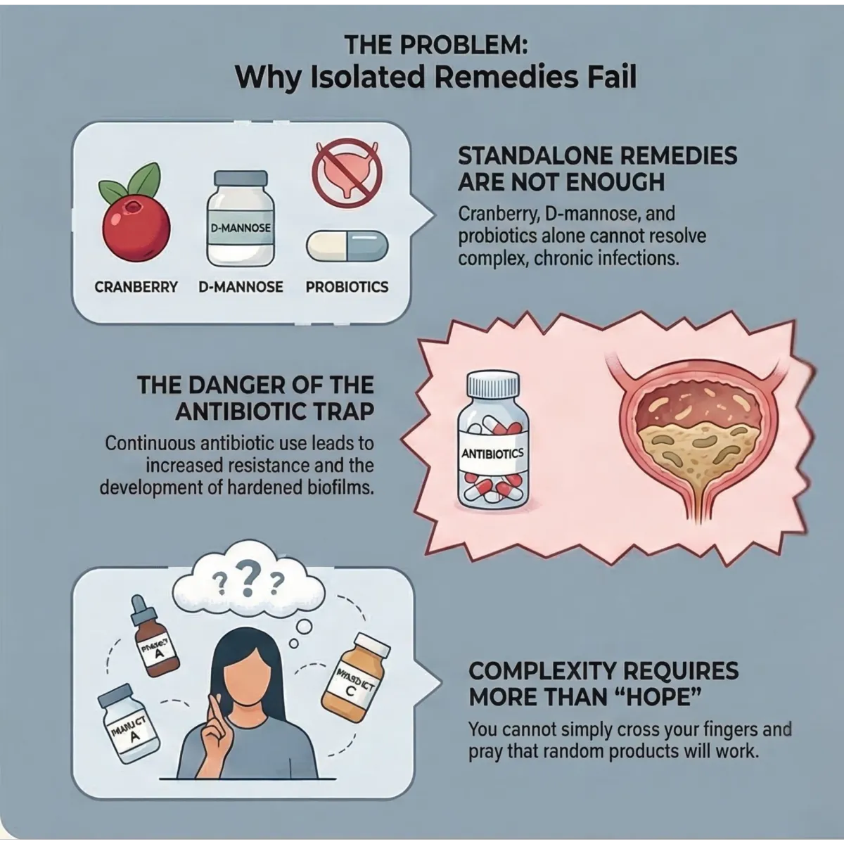 Recurring UTIs are rarely just a simple infection problem. - Bacteria can hide in protective biofilms and return again and again. - There's irritation in the bladder lining - and an environment that allows infections to keep coming back.